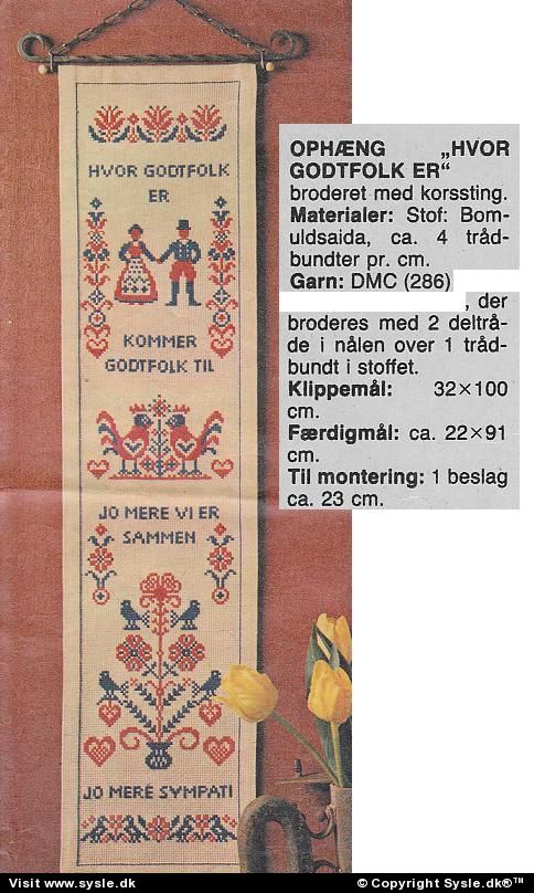 Mønster til Almue klokkestreng str. 22x91cm DMC 321 og 824, syet på Aida 4tern, klippemål: 32x100cm færdig mål. ca. 22x91cm. Hv 16-1980: Ophæng "Hvor godtfolk er kommer godtfolk til jo mere vi er sammen jo mere sympati" Fe 20-19xx: Hvor godtfolk er... - klokkestreng Hv 12-1984: Klokkestreng med almuebroderi. Design: OOE :oe 30786/ "Hvor Godtfolk er, kommer godtfolk til, jo mere vi er sammen, jo mere sympati" #kl.st. br #almue br #rim br #tekst br #2 farver br #OOE br