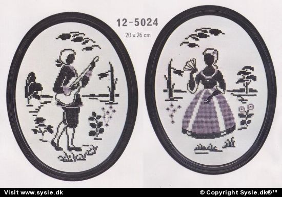Fe 01-19xx: Kønne motiver i korssting - Silhouetbilleder (BF 0137/) Dame med vifte, herre med gitar Design: Pe 12-5024/ #Silhouetter br #oval ramme br #citar br