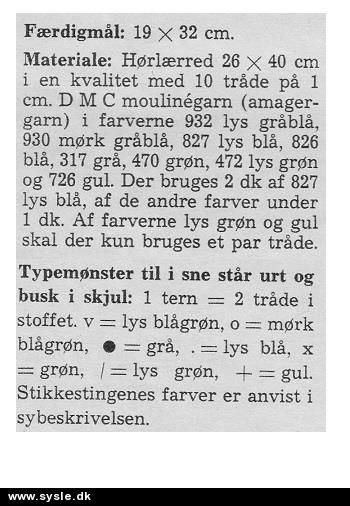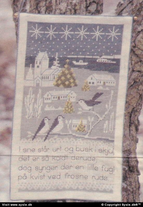 *Materialebrug mm. SE næste FOTO* Sø 43-1974: Sig nærmer tiden - Juleophæng. (Se også Fj 06-xx-) Design: #Højskolernes håndarbejde :HH 26105/ I sne står urt og busk i skjul, det er så koldt derude dog synger der en lille fugl på kvist ved frosne rude. #juleophæng br #rim br #tekst br #kirke br #HH br