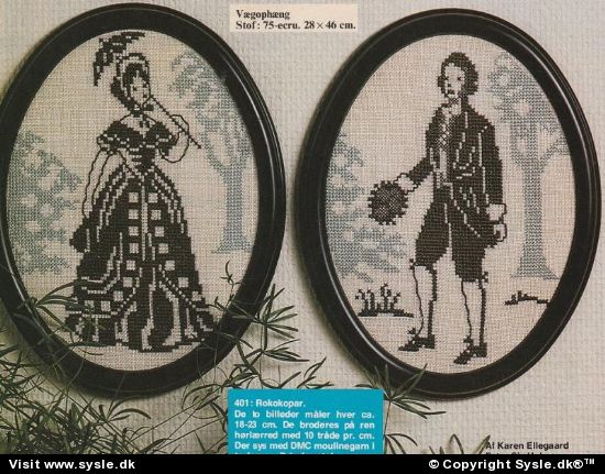 *Materialebrug mm. SE FOTO* Ovale billedophæng: *Rammer medfølger ikke* Fe 04-19xx: Rokokopar i korssting Pe 12-1313/ dame med parasol - herre med hat #Silhuetter br (1085) #oval ramme br