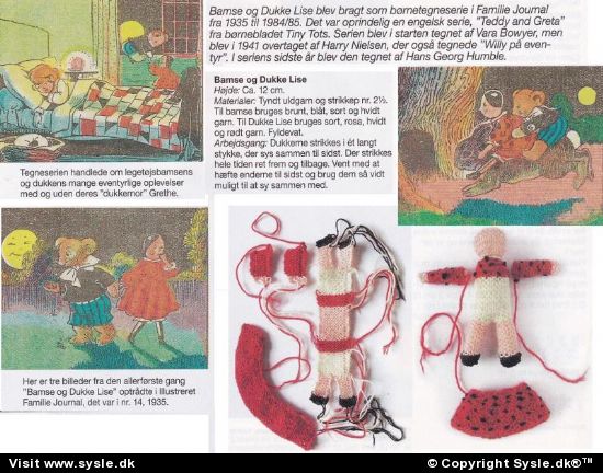 *materialebrug mm. SE også de næste FOTOS* p.3,00 Fj 05-2013: Bamse og dukke Lise længe leve. (mini) Bamse og dukke lise kom til Danmark fra England i april 1935. Serien var skabt at tegneren Vera Bowyer og hed på engelsk Teddy in Toyland. Da den blev oversat til dansk til brug i dansk ugeblad, blev Teddy til Bamse, Greta til Dukke Lise og Marjorie til Grethe. De engelsk tegninger blev brugt til 1941, da den danske tegner Harry Nielsen overtog serien. Bamse og Dukke Lise glædede børnene i 50år, helt præcist fra d. 22. april 1985. #krammedukker st #bamse st #dukke strik