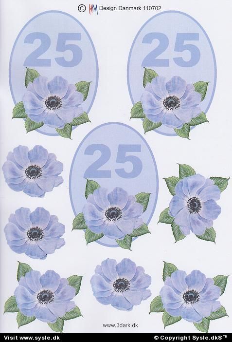 Shop > 3D: Alm./Pyramide > 3D Tal, Tekst > Tal/Blomst - års serie > 0702 - 3D Blomst, 25 års dag (blå) 3 kort