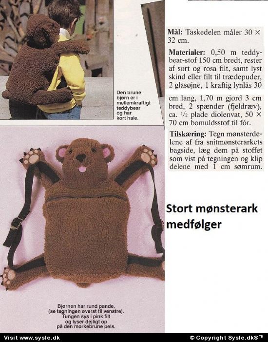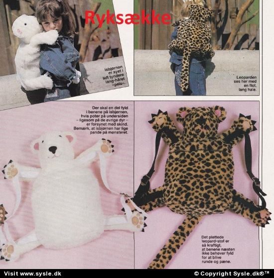 *Maretialebrug mm. SE også næste FOTO* Ao 08-1986: Rygsække: Isbjørn, plettet leopard, Brun bjørn (kan laves også om til en pandabjørn i sort/hvid) Stort mønsterark medfølger. #dyreprint sy #rygsæk sy #krammedyr sy