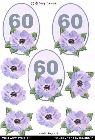Shop > 3D: Alm./Pyramide > 3D Tal, Tekst > Tal/Blomst - års serie > 0766 - 3D Blomst, 60 års dag (lilla) 3 kort